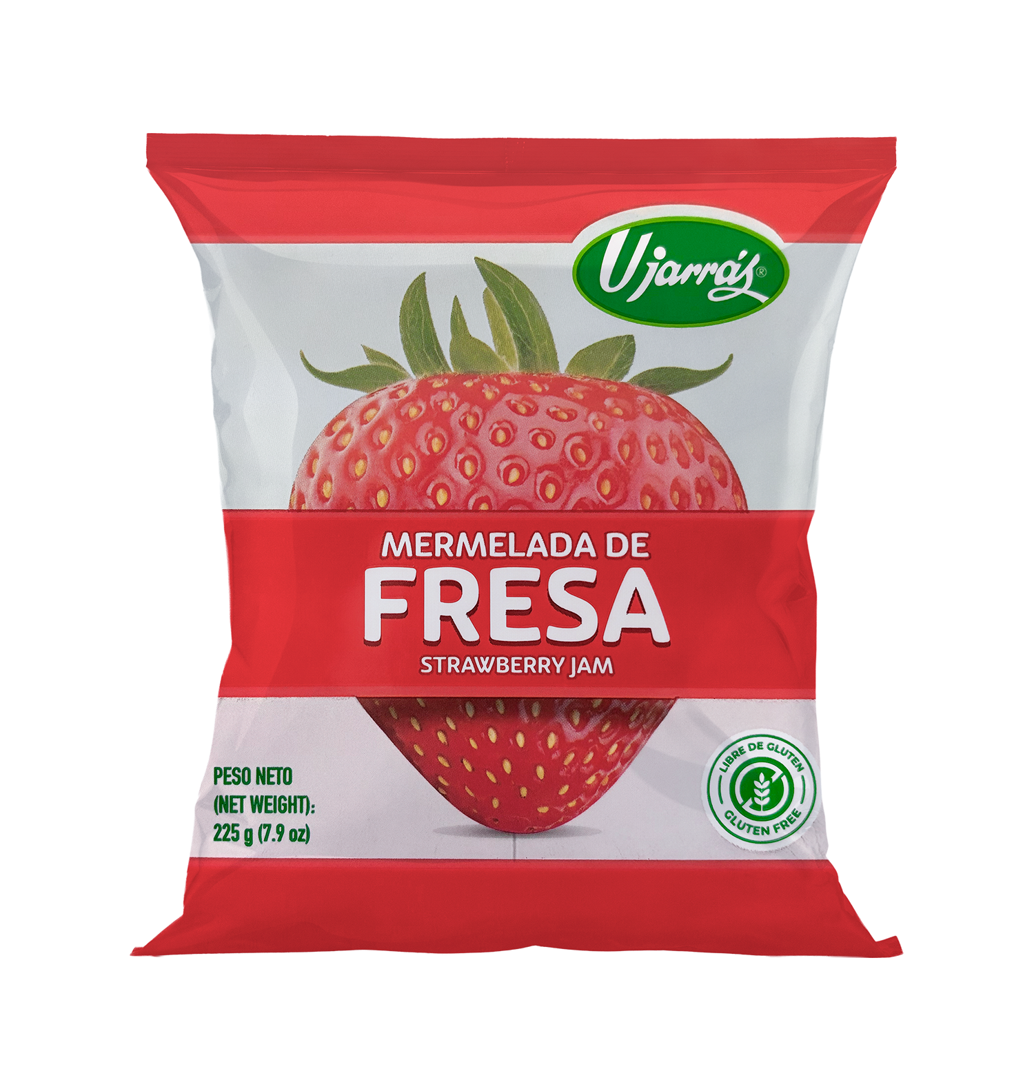 Ingredientes: Azúcar, fresa, pectina (como gelificante), ácido cítrico (como acidulante), benzoato de sodio y sorbato de potasio (como preservantes), colorante FD&C Rojo 40 y saborizante.