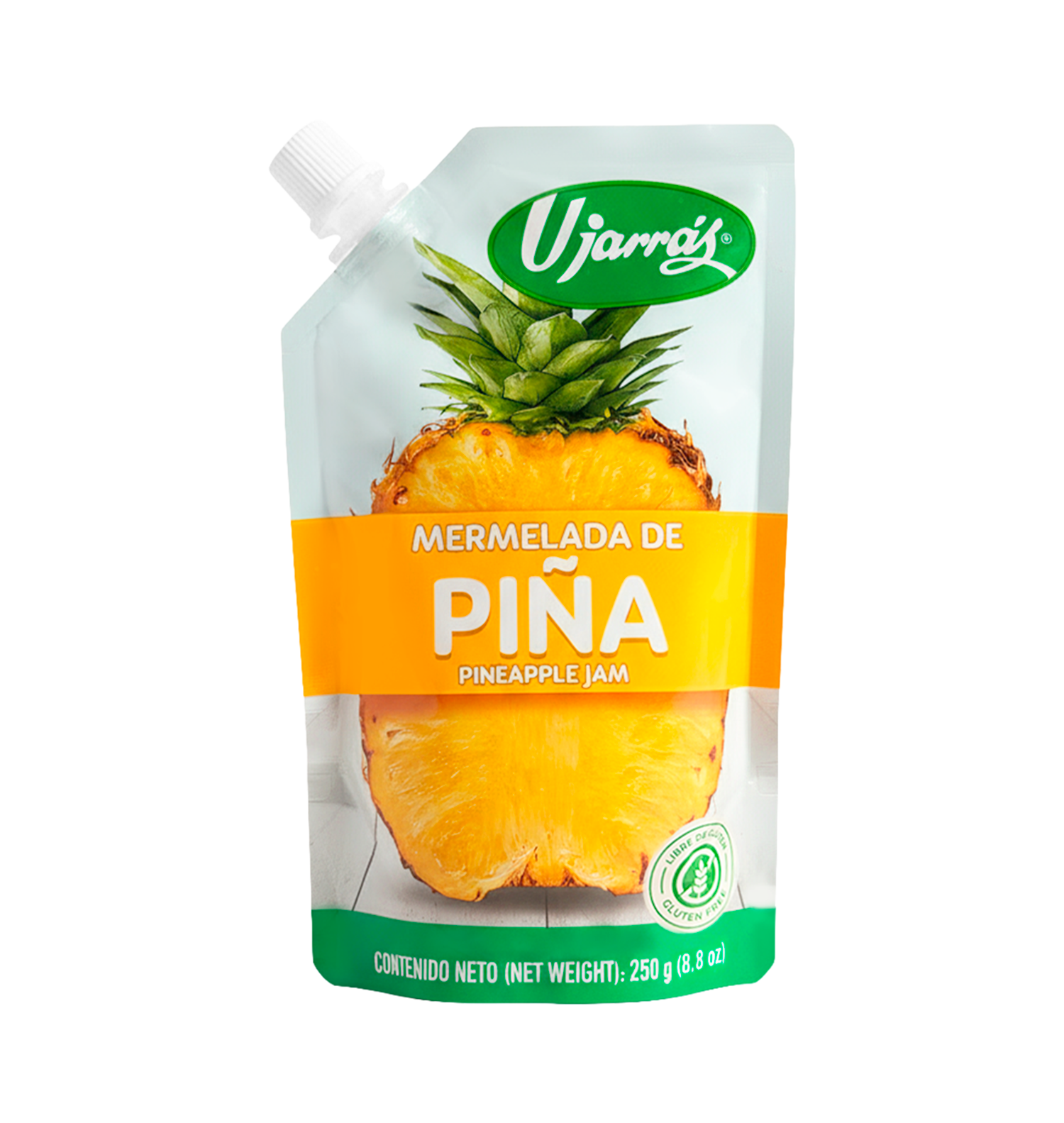 Ingredientes: Azúcar, piña, pectina (como gelificante), ácido cítrico y citrato de sodio (como acidulantes), benzoato de sodio (como preservante), colorante FD&C Amarillo 5 y saborizante.